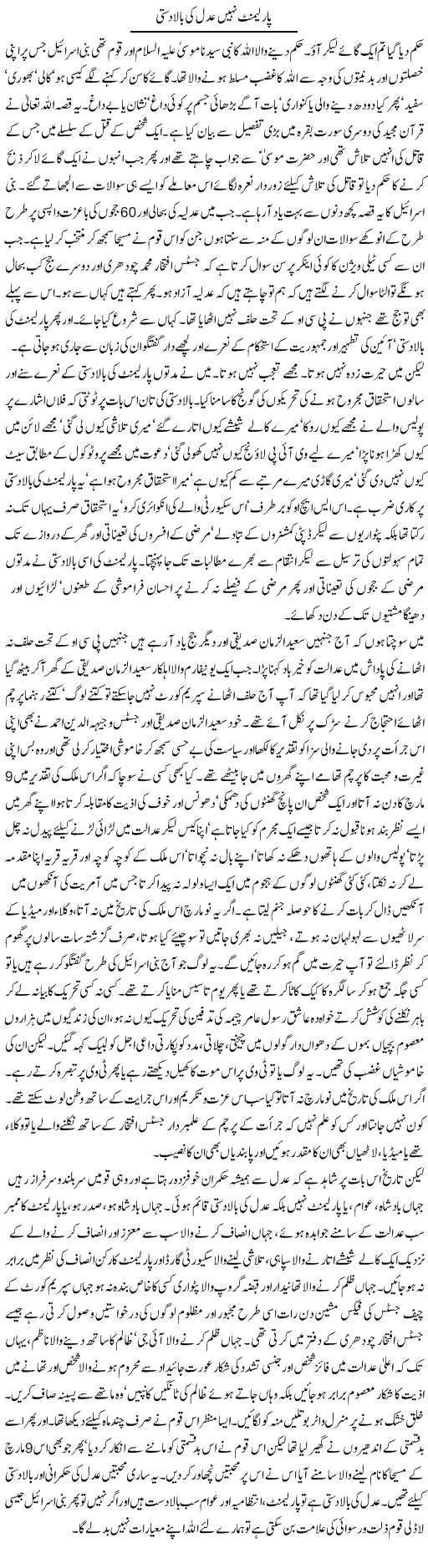 نا پارلیمنٹ نا عدل ھمین صرف اللہ کے حکم کی بالادستی پر یقین رکھنا چاہیئے اور اسی کیلیئے کوشش کرنی چاہیئے، کیونکہ عدالت سے عدل کا مطلب ھے قانون کی حکمرانی، قانون وہ ھے جو پارلیمنٹ بنائے گی، اس طرح دونون مل کر مشیئت ایزدی کیخلاف قانون بنا سکتے ھین، اس لیئے ھمین صرف اللہ کی حکمرانی کی بات کرنی چاہیئے