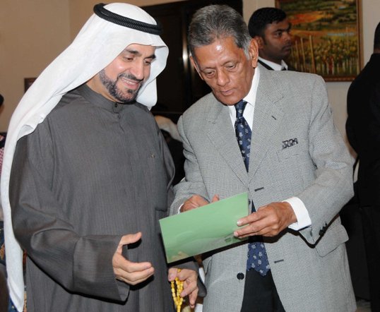 Iqbal Hadi Zaidi, former Business and Manpower Advisor, Pakistan Embassy, Kuwait composed a poem on, 'H.E. Dr Fadhel Safar' on his appointment as Minister of Public Works and State Minister for Planning and Development. This is the 3rd time in continuity that he has been inducted as minister. First time he was inducted as Minister of Public Works and State Minister for Municipal Affairs and when the cabinet was reshuffled, a few ministers lost their jobs whereas some of them tendered resignation but he was again chosen and given the same responsibilities for the second time. Now 3rd time on 13th February 2012 he has been appointed as Minister of Public Works and State Minister for Planning and Development. Photo shows Zaidi reciting his poem which very much moved the minister who immensely thanked Zaidi for composing such a befitting and descriptive poem on such a happy occasion. It is worth mentioning that about 5 years back there was some religious function where I was invited to attend. All people were sitting on the carpeted floor hence I also sat there with many others all around. Dr Fadhel whom I had not met till then was one the members of the organizing committee and when he saw me sitting on the carpet, he came and got me seated in the center of few sofa sets laid up at the back for VIPs. After some time three Members of Parliament and Iranian Ambassador came and they too were seated on sofa sets. I had 2 MPs on my right and 1 on my left. I thanked him for bestowing such honor on me which is rare. We exchanged our introductory cards. At that time he was neither minister nor MP but a Member of Municipal Council and after 2 years he became minister. He is the same minister who has sent flowers to my hotel room on my 25th and 26th wedding anniversaries.
