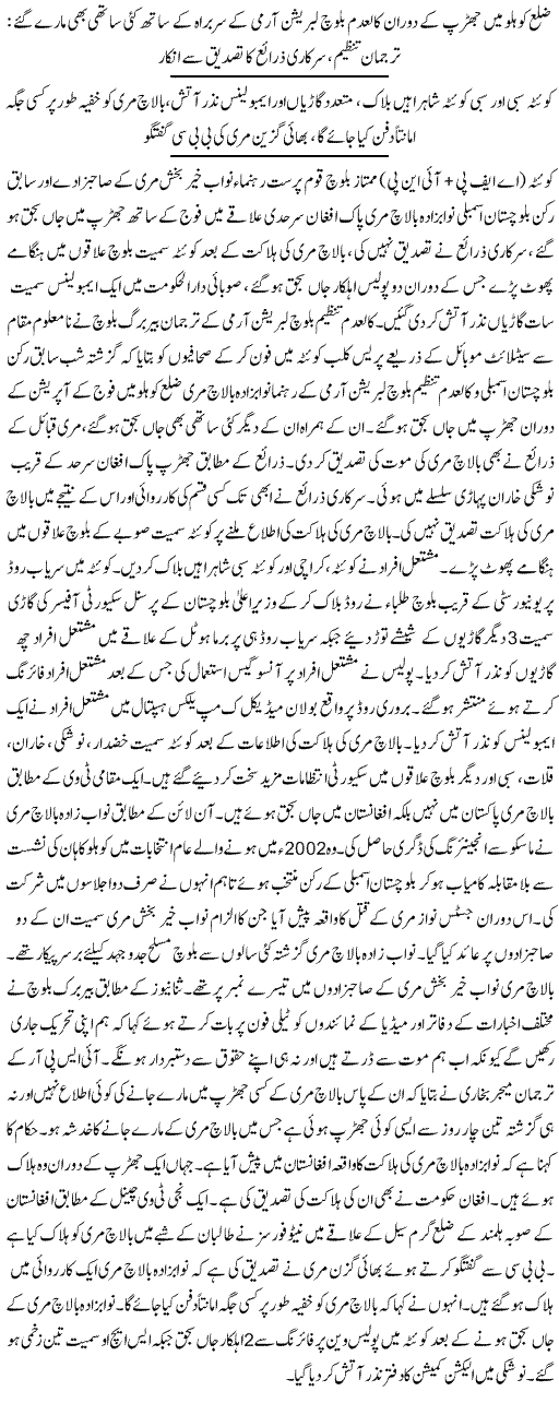 BalochWarna regrets to inform the Baloch Nation, wellwishers of Balochistan and the rest of the world that our great guerrilla leader Nawabzada Balach Marri martyred during a fierce battle with Pakistani forces.