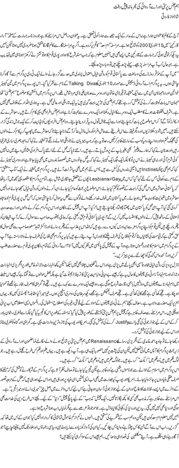Yesterday I learnt of a TV show which was aired on ary digital TV on the 10th of January, a talk sow called "talking Divas". The topic was homosexuality. It was an extremely upsetting and disturbing show. The participants included Muslim girls and boys, Pakistanis, who openly called themselves gay/lesbians.They were fully prepared, quoting ayat numbers from Quran and misinterpreting facts. A few of their quotes (gist) were as below: * Homosexuals are wrongly perceived as being promiscuous. Most homosexuals are only looking for love and care.